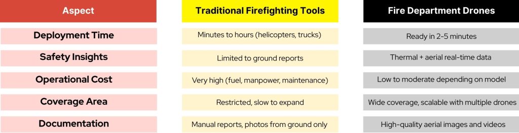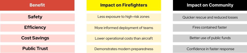 Safety for Firefighters | Higher risk due to blind spots | Reduced exposure with drone surveillance |