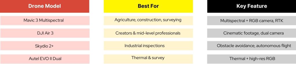 - Surveying & Mapping: Accuracy, RTK support, and flight stability are key.
